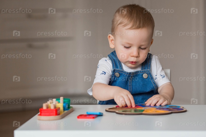Маленький мальчик играет в обучающие логические игры. Детские деревянные игрушки. Сортировщик. Монтессори для развития ребенка