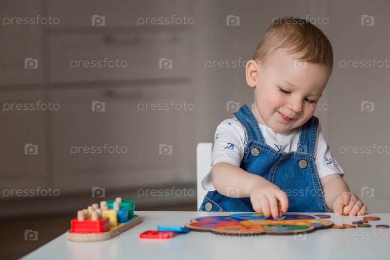 Маленький мальчик играет в обучающие логические игры. Детские деревянные игрушки. Сортировщик. Монтессори для развития ребенка