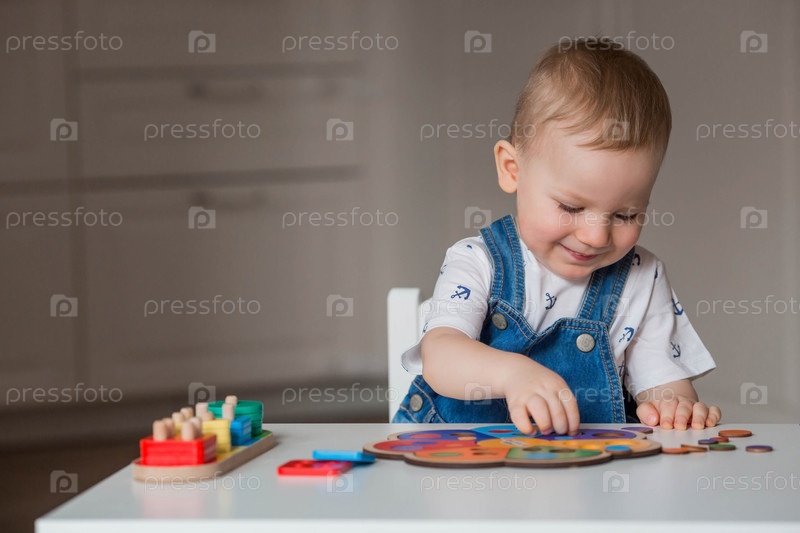 Маленький мальчик играет в обучающие логические игры. Детские деревянные игрушки. Сортировщик. Монтессори для развития ребенка