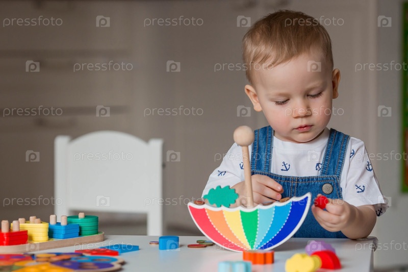 Балансирующие игрушки. Маленький мальчик играет в развивающие игры. Детская деревянная игрушка в виде зонтика, цветной пирамиды и логических игрушек для детей. Монтессори игры для развития ребенка