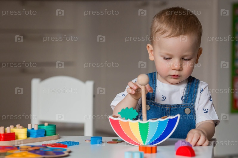 Балансирующие игрушки. Маленький мальчик играет в развивающие игры. Детская деревянная игрушка в виде зонтика, цветной пирамиды и логических игрушек для детей. Монтессори игры для развития ребенка
