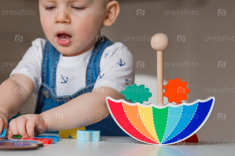 Балансирующие игрушки. Маленький мальчик играет в развивающие игры. Детская деревянная игрушка в виде зонтика, цветной пирамиды и логических игрушек для детей. Монтессори игры для развития ребенка