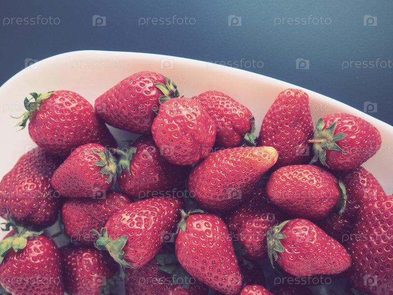 Клубника на тарелке, серый фон. Белая посуда и вкусная красная крупная садовая клубника. Здоровое питание, витамины и вегетарианская диета. Натюрморт с едой. Скопируйте пространство. Плоская планировка