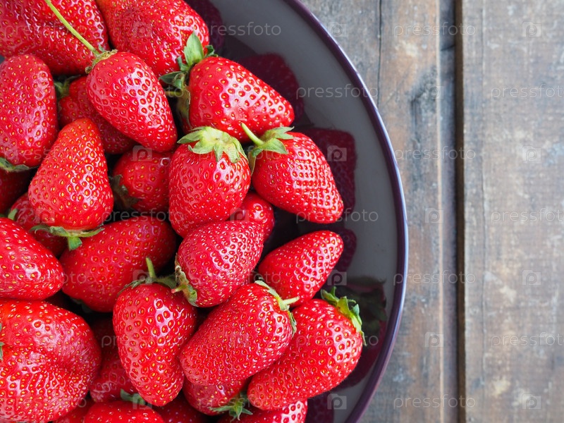 Клубника на тарелке, деревянный фон. Темная керамическая посуда и вкусная красная крупная садовая клубника. Здоровое питание, витамины и вегетарианская диета. Натюрморт с едой. Скопируйте пространство. Плоская планировка