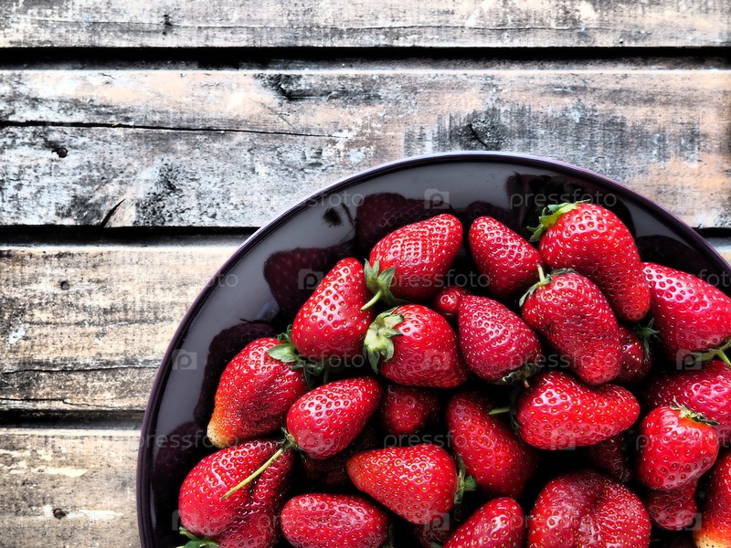 Клубника на тарелке, деревянный фон. Темная керамическая посуда и вкусная красная крупная садовая клубника. Здоровое питание, витамины и вегетарианская диета. Натюрморт с едой. Скопируйте пространство. Плоская планировка