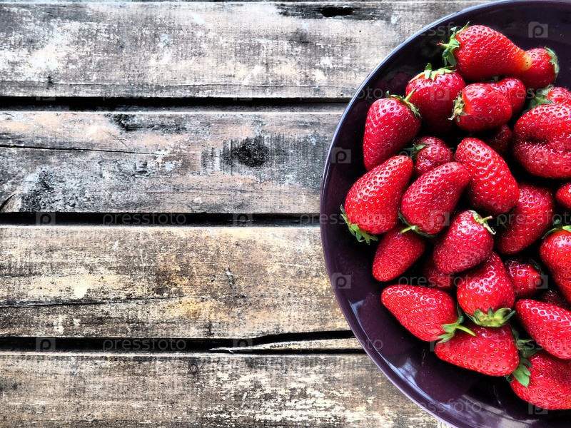 Клубника на тарелке, деревянный фон. Темная керамическая посуда и вкусная красная крупная садовая клубника. Здоровое питание, витамины и вегетарианская диета. Натюрморт с едой. Скопируйте пространство. Плоская планировка