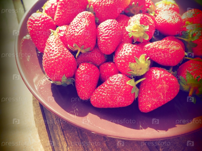 Клубника на тарелке, деревянный фон. Темная керамическая посуда и вкусная красная крупная садовая клубника. Здоровое питание, витамины и вегетарианская диета. Натюрморт с едой. Скопируйте пространство. Плоская планировка