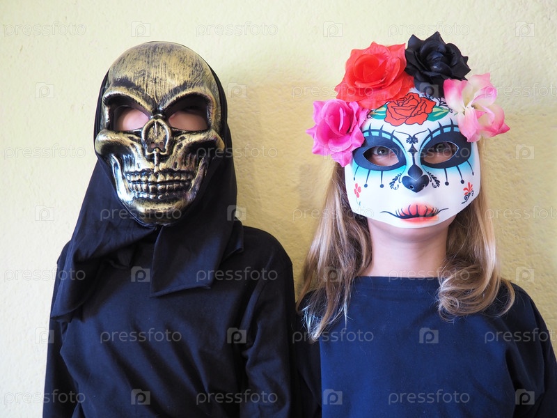Дети одеты в черные костюмы и страшные маски Хэллоуина. Девушка в мексиканской маске Калака Калавера. Мальчик в ужасной маске черепа с черным капюшоном. Канун Дня Всех Святых или тема Всех Святых