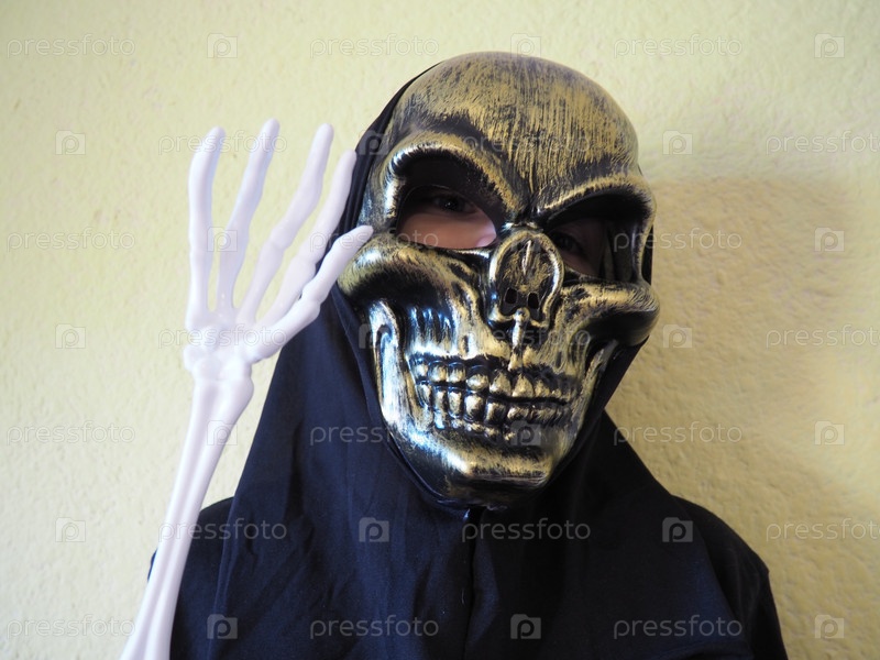 Мальчик-гейзер. Ребенок в маске страшного черепа с черной капюшоном. Черная одежда. Хэллоуин, Всех святых или даже всех святых. Карнавалный костюм. Одна костлявая рука поднята наверх