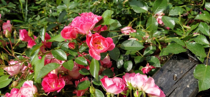 Цветущие розовые кустовые розы в городе. Цветочный фон. Красивые розовые кустовые розы