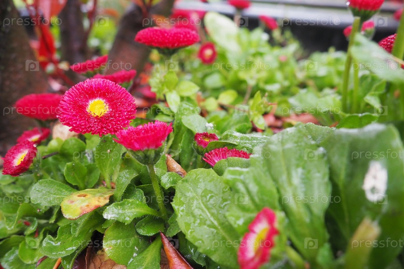 Бордовые махровые многолетние маргаритки на клумбе, садово-огородная гибридная форма. Беллис многолетний. Красные ромашки крупным планом в саду. Цветочная клумба в городском парке. Обыкновенная или английская ромашка, газонная ромашка