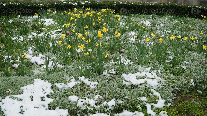 Желтые тюльпаны и Stachys byzantina под снегом. Неожиданный снегопад весной. Дизайн клумбы с газоном. Тюльпан Tulipa растение Lily Liliaceae. Stachys byzantina, род растений Чистота Stachys Lamiaceae