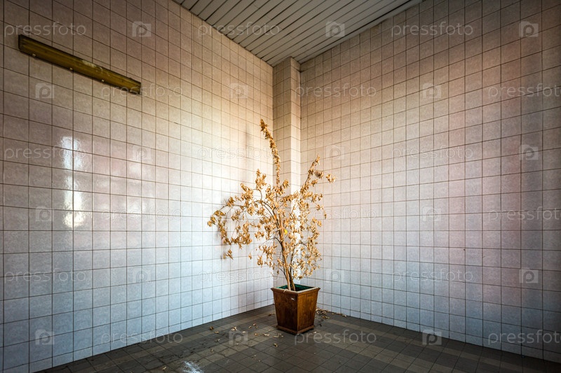 Засохшее дерево в кадке в здании старой фабрики в Москве, Россия