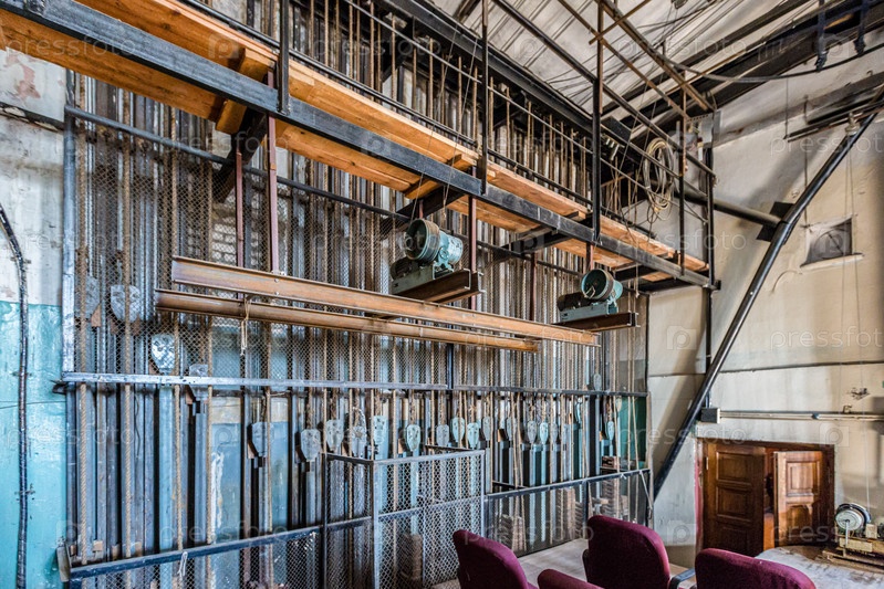 Заброшенный старый театральный зал с красивыми фресками, роялем, сценой и кулисами в Москве, Россия