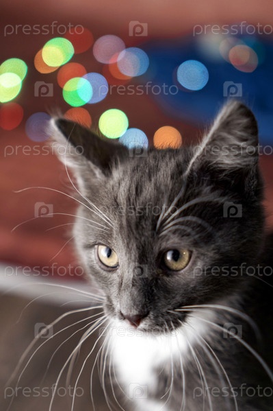 Деревянная коробка с гирляндой на жирном фоне и котенком
