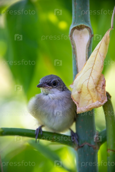Серый птенец сидит на ветке