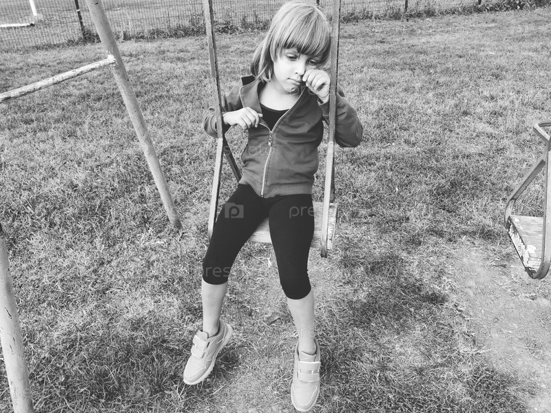 Девушка на качелях. Монохромная ретро фотография. Ребенок в спортивной форме качается. На заднем плане стадион. Грусть на лице. Эмоция разочарования и чувство одиночества