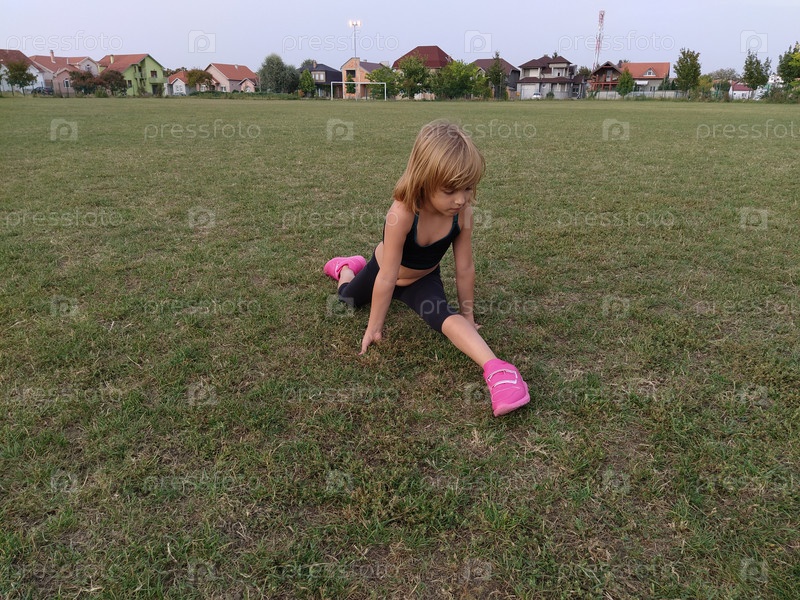 Девочка 6-7 лет занимается спортом на стадионе. Ребенок в спортивной одежде в черных и ярко-розовых кроссовках. Упражнение на растяжку мышц ног Сплит. Кавказская девушка со светлыми волосами