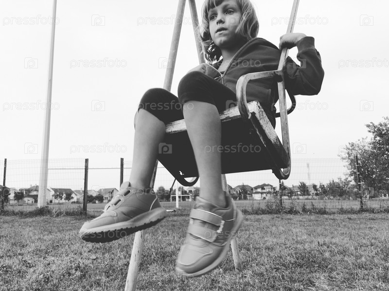 Девочка 6-7 лет качается на качелях на фоне футбольного поля. Черно-белое монохромное изображение в стиле ретро или винтаж. Кавказский ребенок