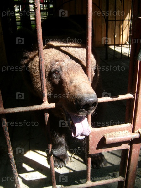 Медведь выглядывает из клетки и высовывает длинный розовый язык. Вольер из металла. Длинные когти на мохнатых лапах. Темные волосы и мокрый нос с двумя ноздрями