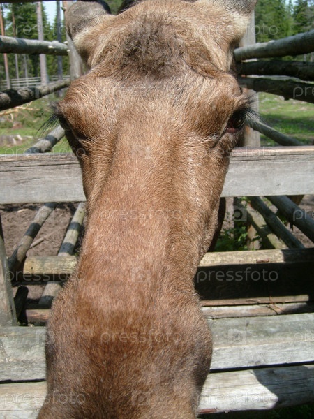 Лось - самка выглядывает из-за деревянного забора. У лося нет рогов. На заднем плане хвойный лес. У животного длинные ресницы и блестящая шерсть