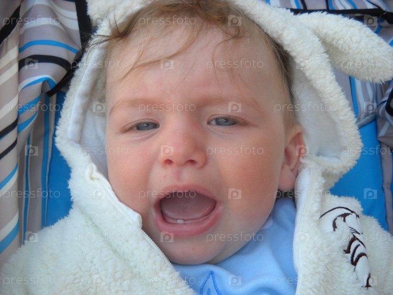 Плачущий ребенок. Симпатичный маленький мальчик в белом комбинезоне сидит в коляске. Детские капризы и гримасы. Белый и синий цвета для одежды и коляски. Кавказский ребенок. Эмоции неудовольствия и разочарования