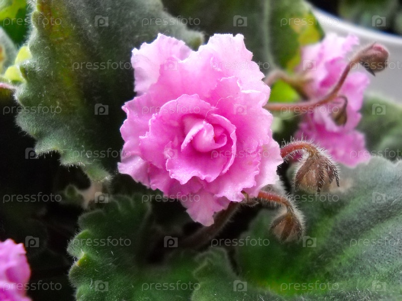 Сенполия или узамбарская фиалка розового цвета с пушистыми зелеными листьями вокруг. Красивый розовый махровый цветок. Многочисленные тонкие ворсинки. Нежное растение родом из Восточной Африки. Крупный план. Домашнее цветоводство