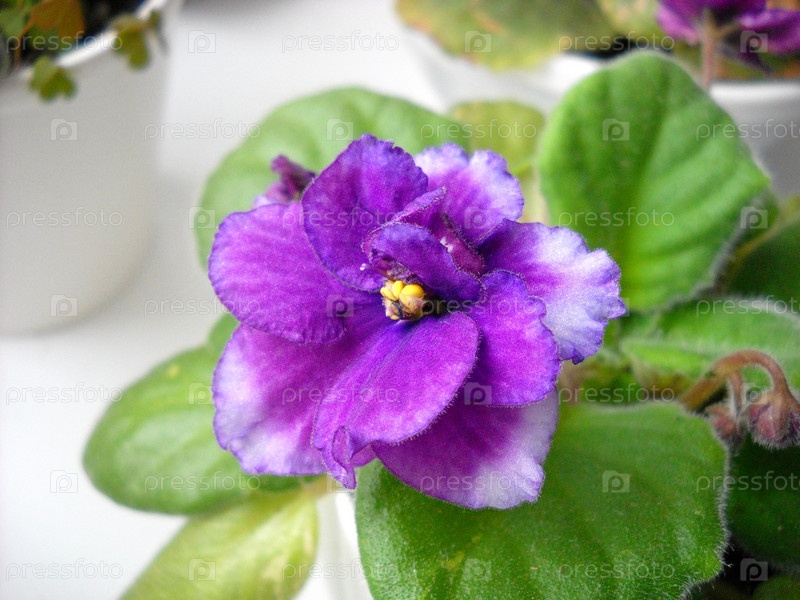 Сенполия или узамбарская фиалка фиолетового цвета с пушистыми зелеными листьями вокруг. Красивый фиолетовый махровый цветок. Многочисленные тонкие ворсинки. Нежное растение родом из Восточной Африки. Крупный план. Домашнее цветоводство