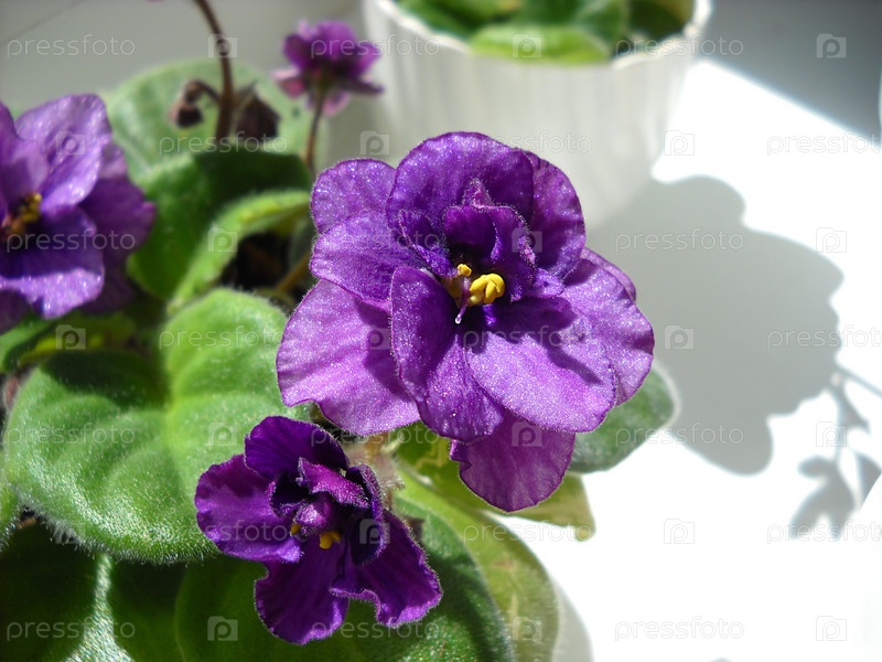 Ярко-фиолетовые сенполии. Несколько цветов. Комнатное растение. Домашний интерьер и уют. Крупный план на белом столе