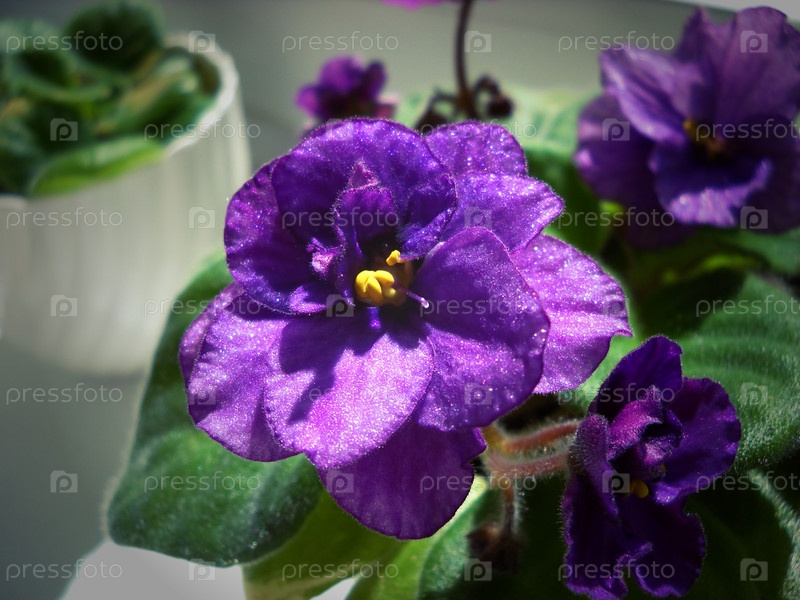 Узамбарская фиалка или сенполия фиолетового цвета с пушистыми зелеными листьями вокруг. Красивый фиолетовый махровый цветок. Многочисленные тонкие ворсинки. Легкое темное виньетирование. Крупный план. Домашнее цветоводство