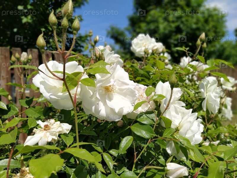 Белые розы в саду, солнечная погода