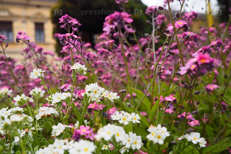Незабудки.Миозотис цветет розовато-белыми растениями семейства Boraginaceae.Незабудки или скорпионные травы.Цветы Myosotis alpestris для украшения газонов и клумб.Садовый пейзаж