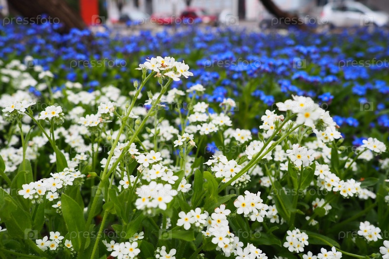 Незабудки.Миозотис цветет голубо-белыми растениями семейства Boraginaceae.Незабудки или скорпионные травы.Цветы Myosotis alpestris для украшения газонов и клумб.Садовый пейзаж