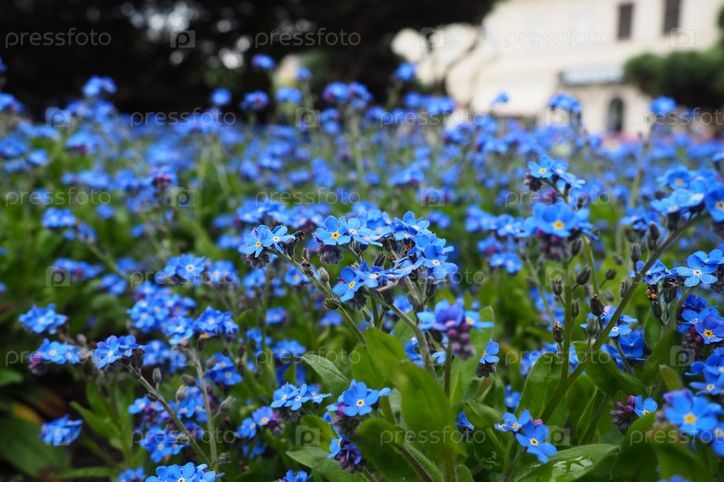 Незабудки.Миозотис - голубые цветущие растения семейства Boraginaceae.Незабудки или скорпионные травы.Цветы Myosotis alpestris для украшения газонов и клумб.Садовый пейзаж