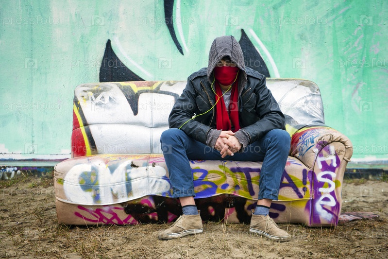 Молодой человек с характером в шарфе на лице сидит на диване на фоне стены, разрисованной граффити