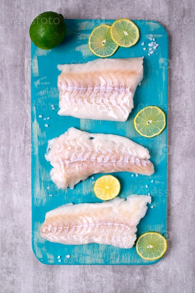 Сырое филе трески на деревянной доске бирюзового цвета с ломтиками лайма и солью. Ингредиент из свежих морепродуктов. Приготовление белой рыбы