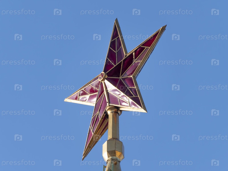 МОСКВА, РОССИЯ, 10 июня 2019 г.: Рубиновая звезда на шпиле Спасской башни Московского Кремля 10 июня 2019 г. в Москве, Россия
