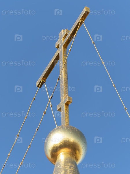 Золотой купол с православным крестом крупным планом на фоне голубого неба