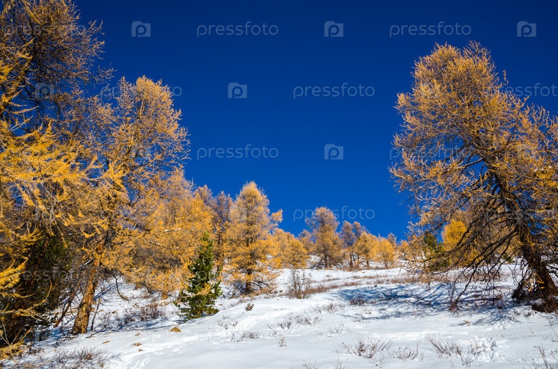 Желтые деревья, снег и синее небо