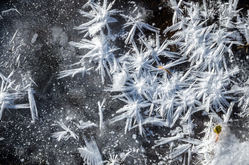 Кристаллы снега и иней на льду