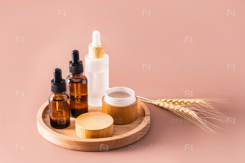 Набор косметических органических продуктов для ухода за собой. Натуральная косметика для всех типов кожи в стеклянных флаконах с пипеткой и бамбуковой баночке