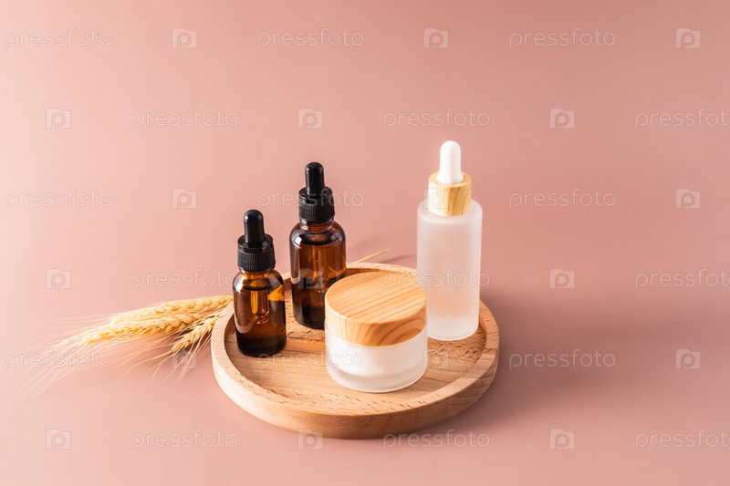 Три разные косметические бутылки с капельницей с органическим натуральным средством и баночка крема на деревянном круглом подносе и бежевом фоне