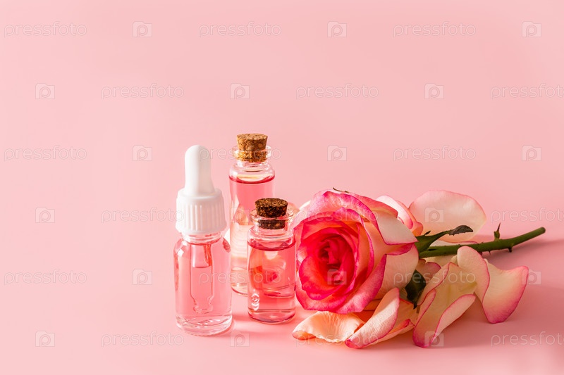 Набор косметических средств на основе розового масла для ухода за кожей лица и тела. натуральная косметика. Розовый фон. Копия пространства
