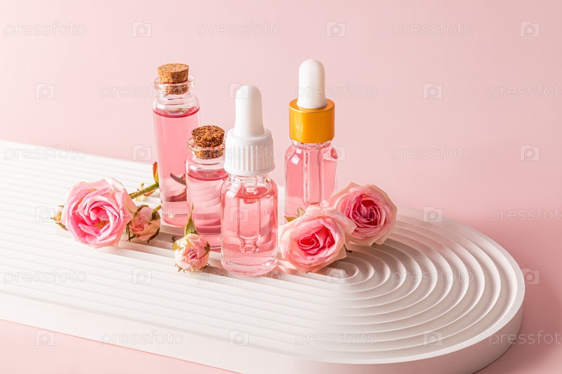 Набор косметики на основе розового масла, бутилированной розовой воды с крышкой-подставкой на белом подиуме, рельефной аркой и бутонами розовых роз
