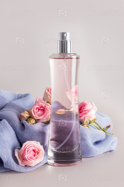 Шикарный флакон женских духов на фоне шифонового платка с нежными живыми розами. Вертикальный вид спереди. пастельный фон