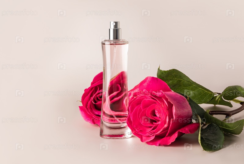 Элегантный флакон женских духов или туалетной воды на фоне свежей шикарной розы. пастельный фон с копией пространства