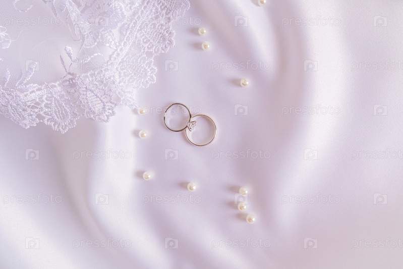 Вид сверху на два обручальных кольца из платины с бриллиантами на белом шикарном атласном фоне с мягкими волнами и жемчугом. Свадебный фон