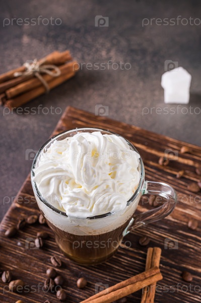 Чашка сладкого венского кофе со взбитыми сливками на темном фоне по вертикали