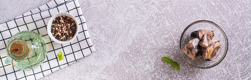 Кусочки консервированного тунца в стеклянной миске на веб-баннере с видом на стол