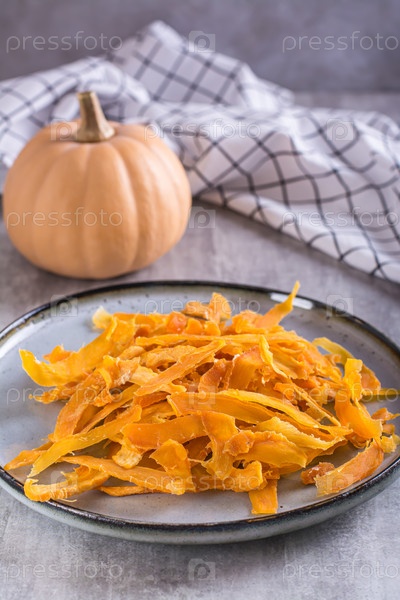 Аппетитные вегетарианские десертные тыквенные чипсы на тарелке на столе, вертикальный вид